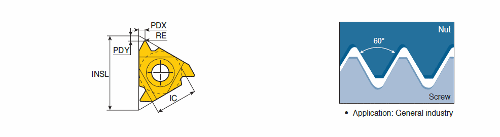 | Designation | IC | TPN | TPX | TPIX | TPIN | INSL | RE | PDY | PDX | Tough ‹————› Hard Grade & Vc Click on grade for cutting speed value | ||||||||