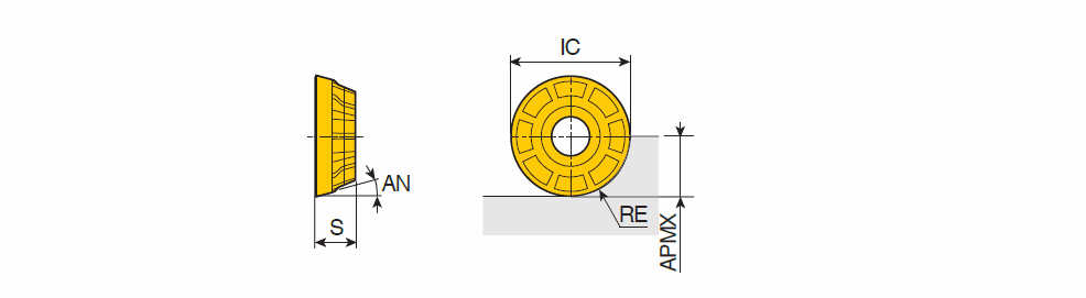 | Designation | IC | S | RE | APMX | ap (min) | ap (max) | fz (max) | fz (min) | Tough ‹————› Hard Grade & Vc Click on grade for cutting speed value |