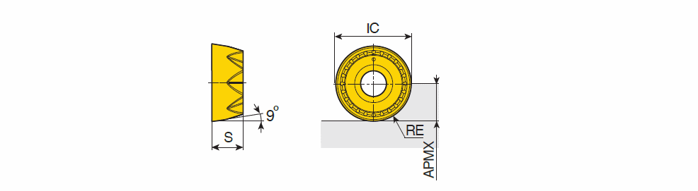 | Designation | IC | S | RE | APMX | ap (min) | ap (max) | fz (max) | fz (min) | Tough ‹————› Hard Grade & Vc Click on grade for cutting speed value |